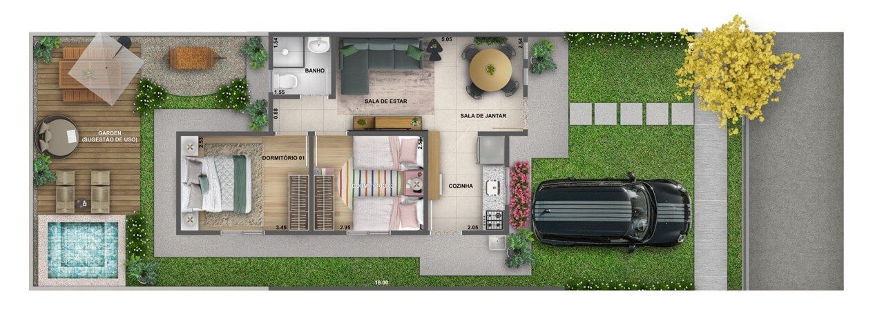 As casas não serão entregues decoradas. Móveis, utensílios de decoração não fazem parte do contrato de compra. *As unidades serão entregues conforme Memorial Descritivo. **As casas 143 a 196 da quadra K e as casas 287 a 296 da quadra T, terão talude nos fundos dos lotes com aproximadamente 2m de profundidade e 2m de altura